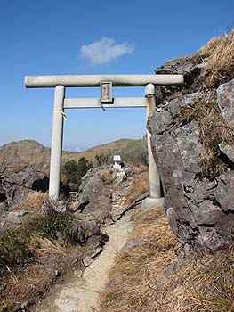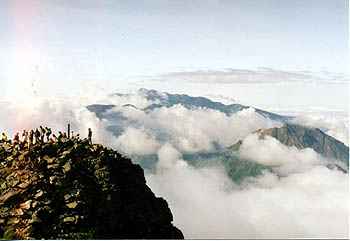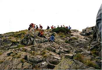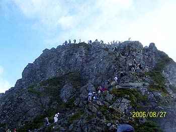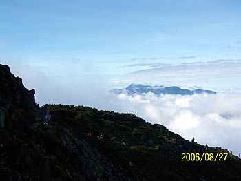 | 8月27日(日)。夜中に雷雨があった。 御来光を期待したのだが、明け方から雨は あがったものの、視界10m程度のガス。 5時30分に朝食をとり、列を作って朝のお勤め の順番を待ち、6時30分に、霧の中を出発。 丸山を過ぎるころに、雨具を脱ぐ。 30分くらいすると、部分的に青空が見え、独標 が近くなる頃には、尾根の西側(笠ケ岳)から 霧が晴れてきて、時折「焼岳」や、雲に顔を出す 「乗鞍岳」などがはっきりと見えてくる。 歩いている間はTシャツで十分だが、谷から 掛けあがる風が休むと寒いくらいだ。 8時頃には、「独標」に着く。頂上はとにかく 人でいっぱい。次の行動をとらざるを得ない。 |