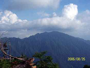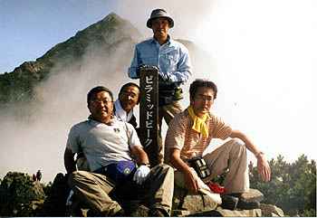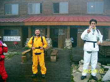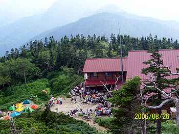 | 8月26日(土)は、新穂高ロープウェーに乗り 山頂駅まで。午後2時頃に山頂駅を出発し、 3時頃に「西穂山荘」に到着。 山荘の玄関は、宿泊受付でごったがえしの状態。 受付を済ませ部屋へ案内され、「今日は満員で」 布団1枚に2人が寝るスペース!男女混合。 シーズン中の山小屋はこれでもいいほうかも! さて、荷物を置いて、10分ほどの「丸山」まで! 上高地を眼下にして、霞沢岳が迎えてくれました。 明日の目標の西穂方向はガスで見えず、 一瞬「独標」が見えた。 頑張るぞ!と6人の仲間は腹の中でつぶやいた。 |