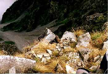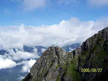 下の2枚は、西穂高岳頂上からのもので、左は、人なつっこい「イワヒバリ」を中心に崖下を撮りました。 右は、ガスに隠れた「ジャンダルム」方向です。 今回の山行で感じたことの1つに、動物たちが意外と人間を恐れないということです。 雷鳥にしろ、オコジョにしろ、そしてこのイワヒバリ!みなほとんど近くにいました。 |
