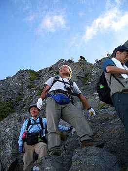 | 素人さんは、独標で引き返すというが、今回の うちのパーティーには、初めてという輩がいた。 しかしその輩が、なんとも元気な輩で、 ピラミッドピークで4人が残り、私とその新人が 西穂まで行ったというのだ。 自然が相手だけに、けっして無理をしないよう 自分を含め皆に言っていたが、初心者はとかく 怖いもの知らずとくる。今回天候にも恵まれた ので、初心者も数年中にはベテランの域に 入るかも! 独標から西穂までは、断崖続きの尾根道。 一つ間違えればゾットする危険個所もいっぱい。 そんな中、雷鳥やオコジョなどが人を恐れず 顔をだすのが嬉しかった。 |